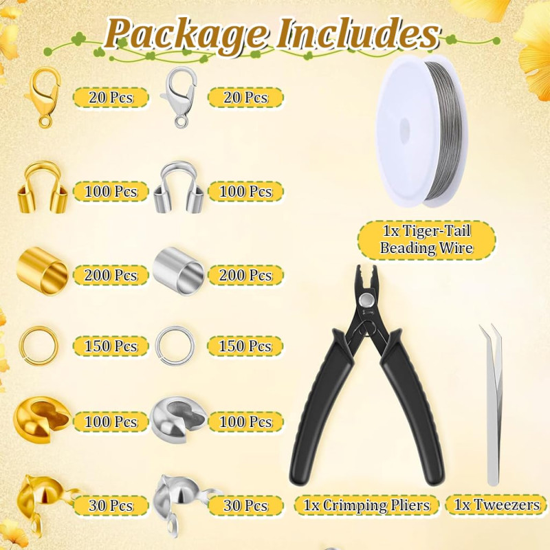 SANNIDHI® 1200Pcs Crimp Beads for Jewellery Making Kit, Includes Gold Silver Bracelet Clasps and Closures, Crimp Covers/Tubes/Ends, Jump Rings, Pliers, Tweezer & Beading Wires for DIY Necklace Jewelry