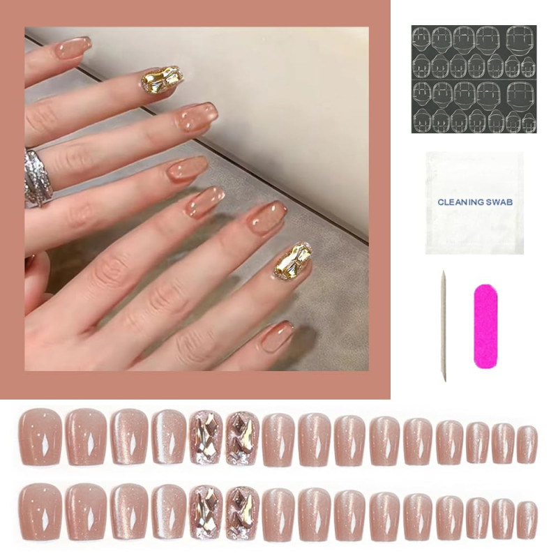 Secret Lives Cats Eye Reusable Artificial Nude Brown Color with Golden Glitter & Crystal Design Press on Nails 24 Pieces Set with Kit
