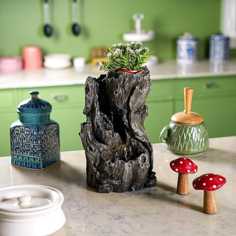The Artment Mystic Canopy Rainforest Tree Trunk Shape Indoor Table Top Showpiece for Living Room, Office, Home Decor Waterfall Fountain with LED Lights | 14 Inch, Grey